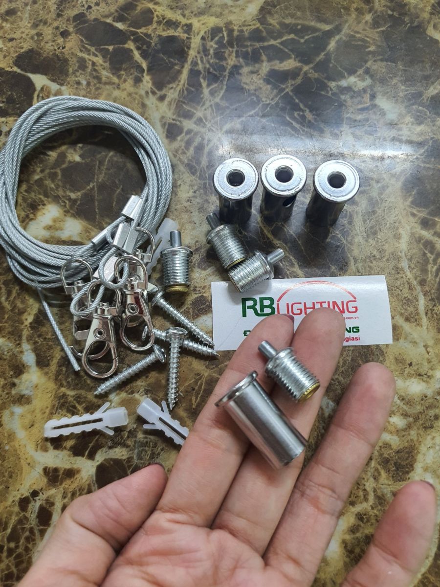 - 1 bộ cáp bao gồm: 4 dây cáp treo có móc và phụ kiện khóa cáp, ốc, vít, tắc kê