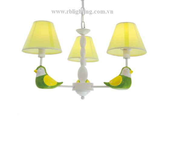 - Chất liệu: thân bằng kim loại sơn tĩnh điện màu trắng, chao bằng vải bố màu vàng, kết hợp với những chú chim bằng sứ màu xanh lá